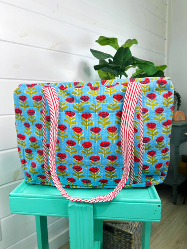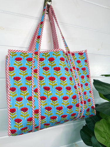 Quilted Tote Bag | Blue Floral Bag | Large Shopping Tote Bag
