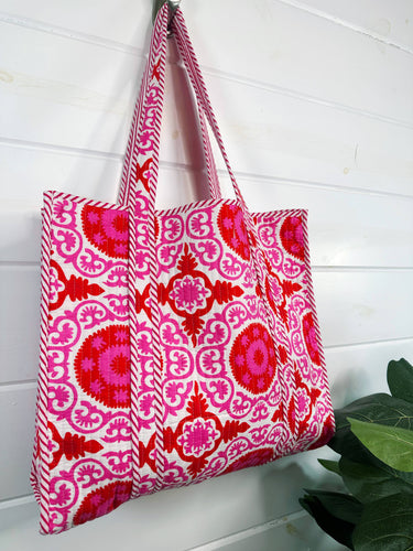 Quilted Tote Bag | Pink Red Tote | Large Shopping Tote Bag
