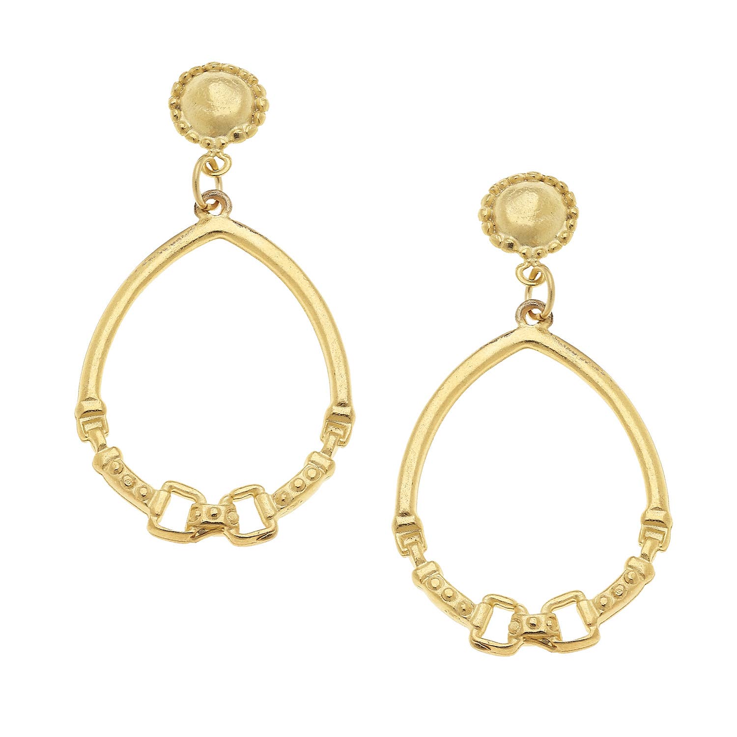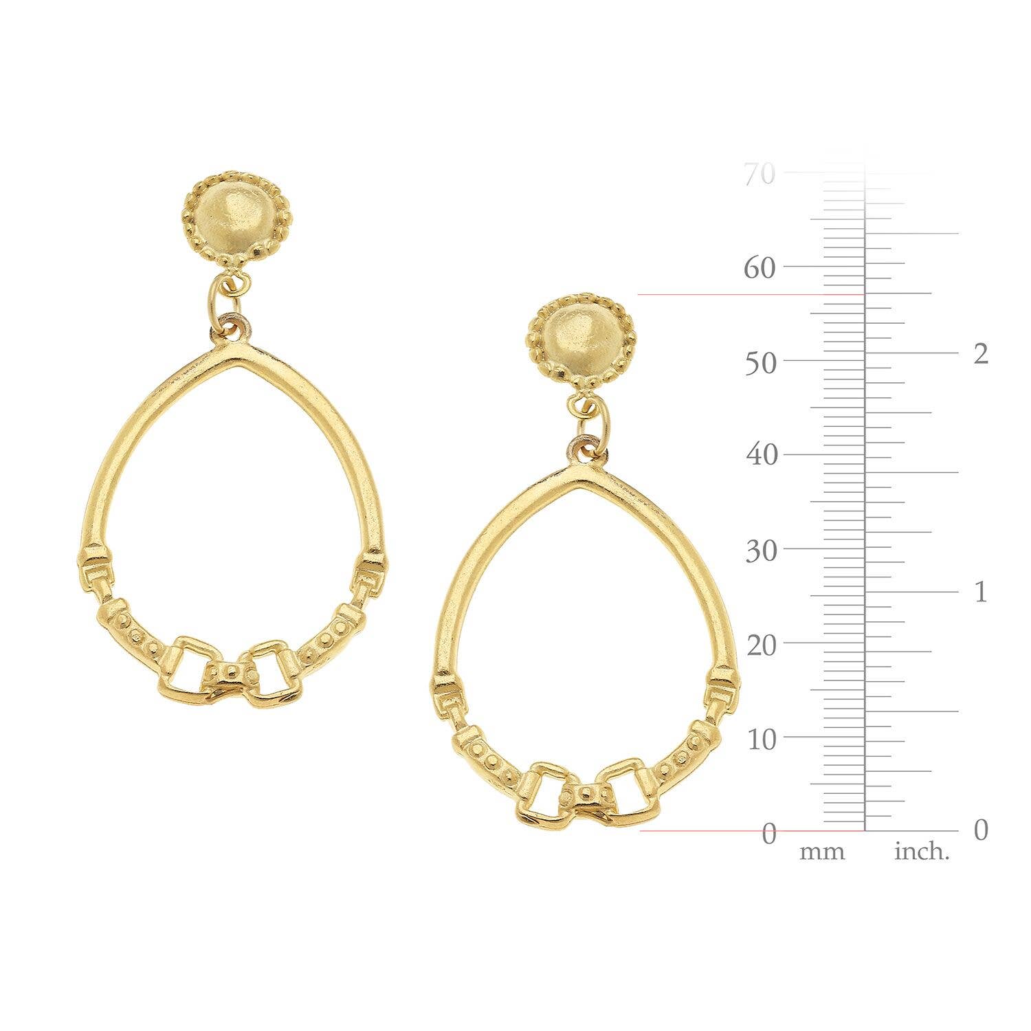 Introducing the Gold Cab and Horse Bit Hoop Earrings by Susan Shaw. These elegant dangle earrings feature a unique drop design of 1.25" x 2.25". Drawing inspiration from Northern European styling, these earrings are handcrafted by experienced artists in our boutique workshop in San Antonio, TX. Every piece is created with the highest quality plating methods, ensuring long-lasting wear and timeless elegance. Susan Shaw is a trusted name in unique and elegant jewelry design, with a reputation for quality that exceeds expectations. These earrings are a testament to our commitment to superior craftsmanship and style.