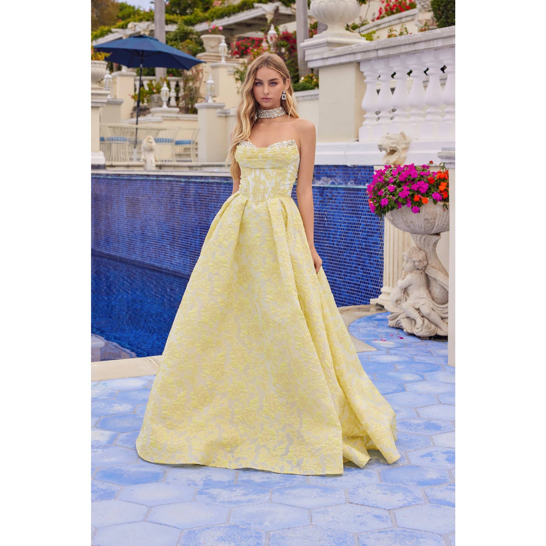 The jacquard fabric adds subtle texture and dimension, making it feel special without needing heavy embellishment. The full skirt has volume, but it’s balanced and polished rather than overwhelming.