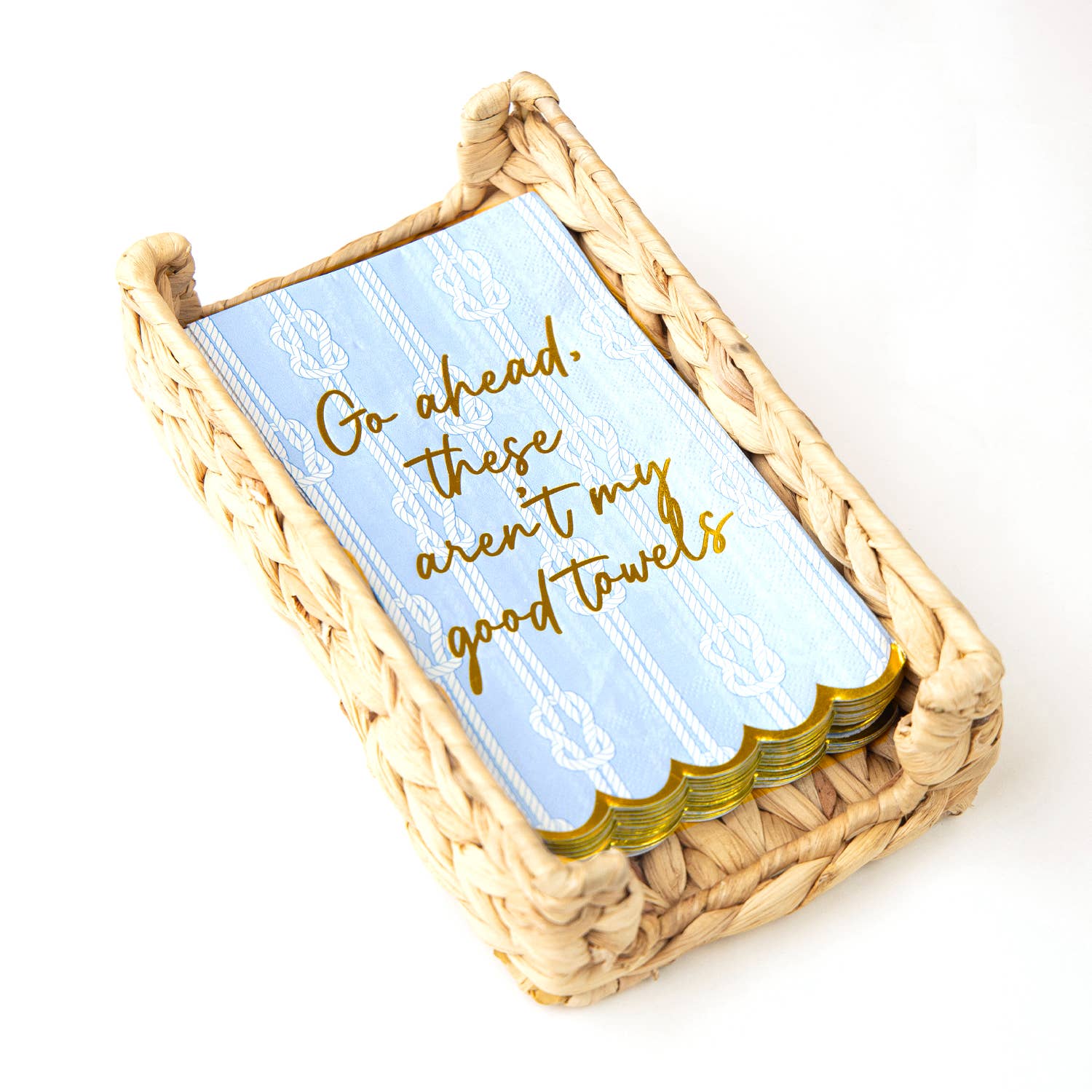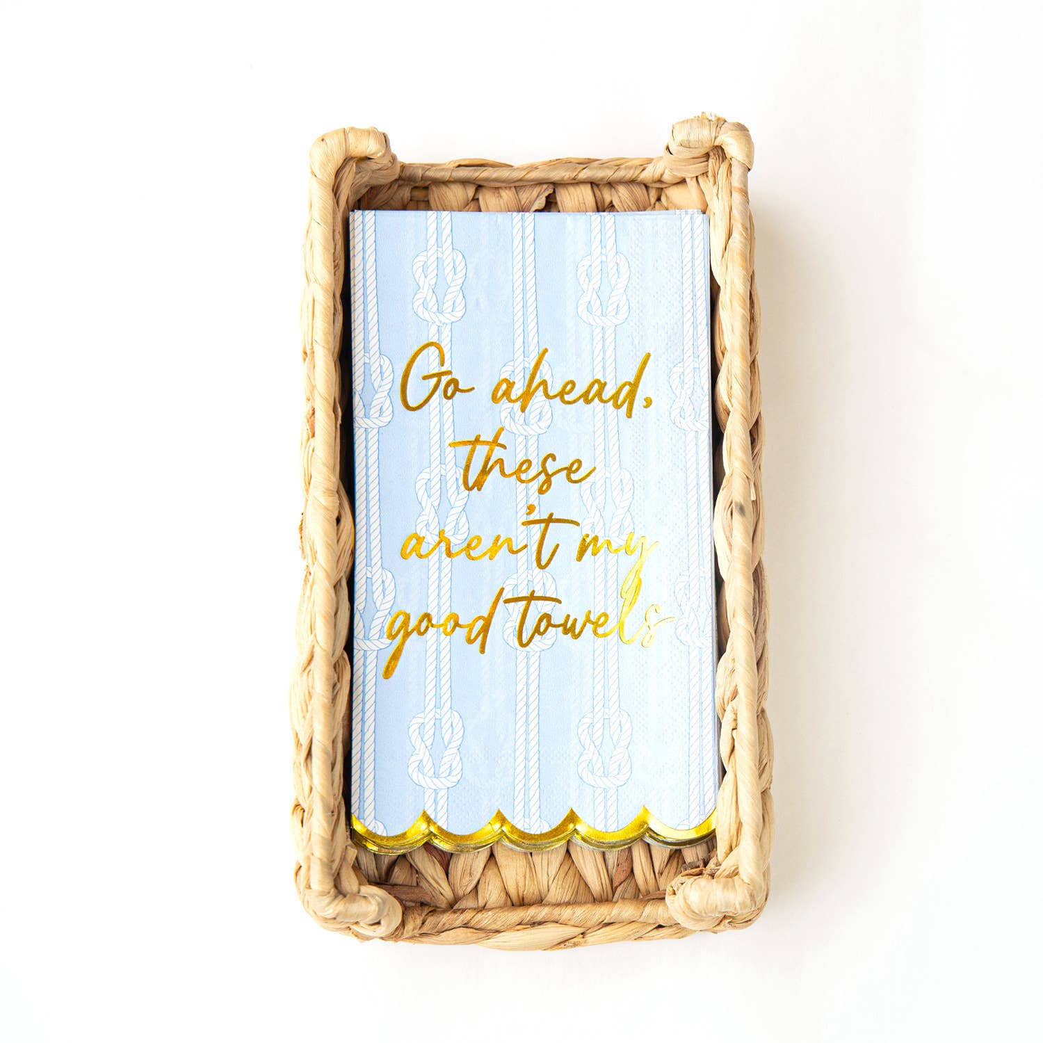 Make a classy statement with these stunning Nautical Knot Paper Guest Towel Packs! Beautifully designed to bring effortless sophistication to any gathering, your guests will love the delightful pattern and luxurious gold foil scalloped edges. Not only truly mesmerizing in appearance, but they also still offer the convenience of being a disposable product that makes clean up a breeze. The guest towel packs come with 16 single-use towels per pack, measuring 8" x 4.25" and designed in the USA with imported materials. For added grandeur, pair these guest towels with our napkin holders, available in both gold and natural rattan. With this incredible set, you are sure to have the perfect conversation starter for any table, bathroom, or bar cart!
