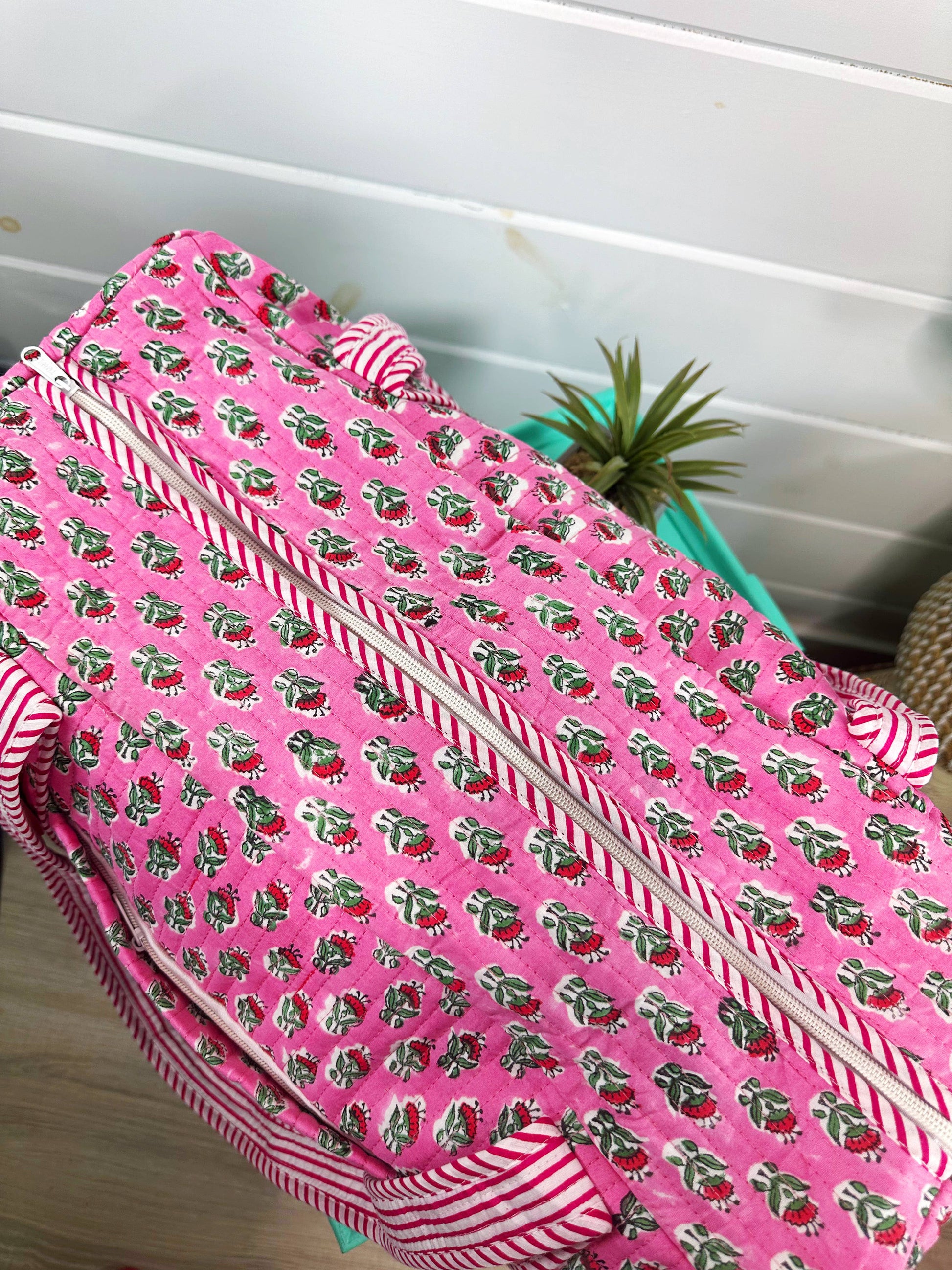 Quilted hand block print, contrasting trim and interior. Perfect for a overnight, weekender travel bag and more!
